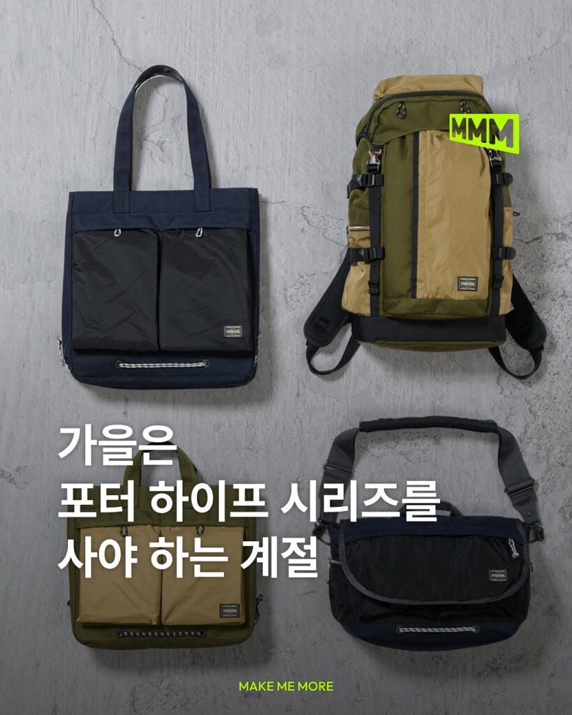 내마모성이 뛰어난 코듀라 나일론과 가볍고 내구성이 우수한 립스톱 나일론을 사용해 디자인과 실용성을 모두 잡았습니다. 컬러는 카키/샌드와 네이비/블랙 두 가지로 선보이며, 백팩, 메신저백, 토트백 등 총 6가지 모델로 전개됩니다. 포터의 ‘하이프’ 시리즈를 슬라이드를 넘겨 확인해 보세요✔️