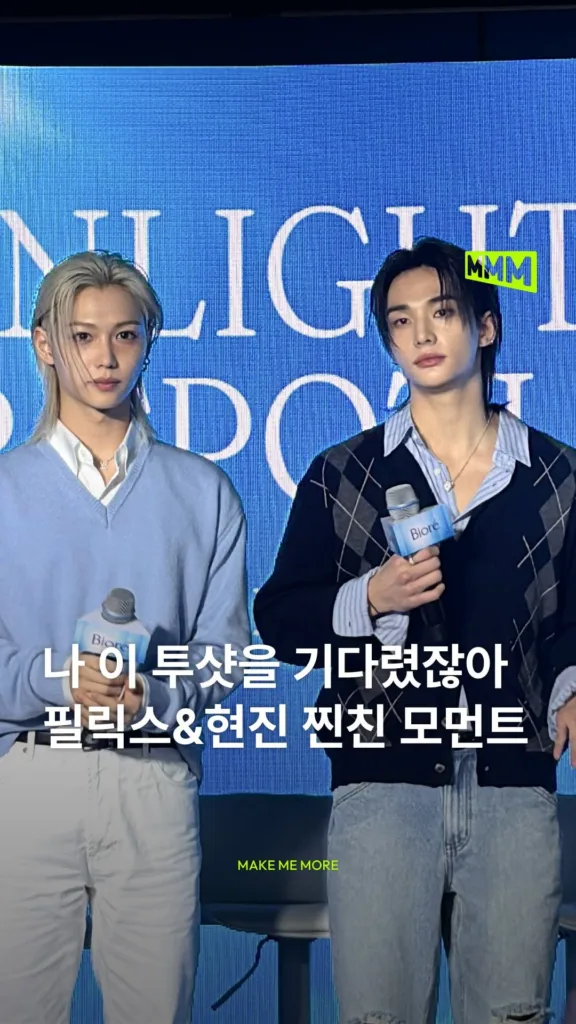 비오레(@biore_kr) 행사장에 등장한 스트레이 키즈(@realstraykids)의 현진(@hynjinnnn)과 필릭스(@yong.lixx)! 둘의 꽁냥꽁냥 찐친 모먼트 보고 에디터 이빨만개 웃음 짓잖아🥹 나 이 투샷 증말로 많이 기다려왔어요..🫶🏻