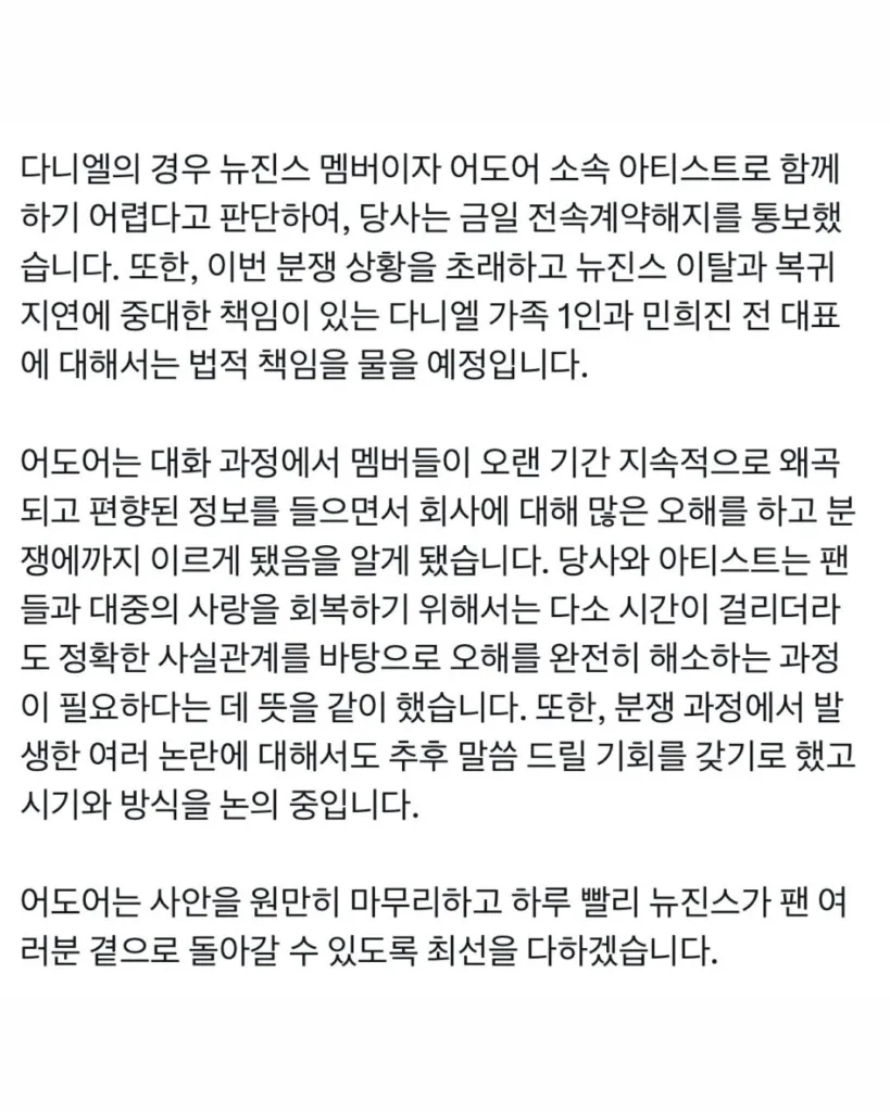 어도어(@alldoorsoneroom)가 뉴진스(@newjeans_official) 멤버 복귀에 관한 공식 입장을 밝혔습니다. 입장문에 따르면 하니는 어도어에 복귀하며, 민지는 아직 합의 중임을 알렸는데요. 반면 다니엘에게는 전속계약 해지를 통보했습니다. 이후 ‘이번 분쟁 상황을 초래하고 뉴진스 이탈과 복귀 지연에 중대한 책임이 있는 다니엘 가족 1인과 민희진 전 대표에 대해서는 법적 책임을 물을 예정’이라고 밝혔습니다.