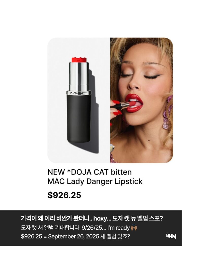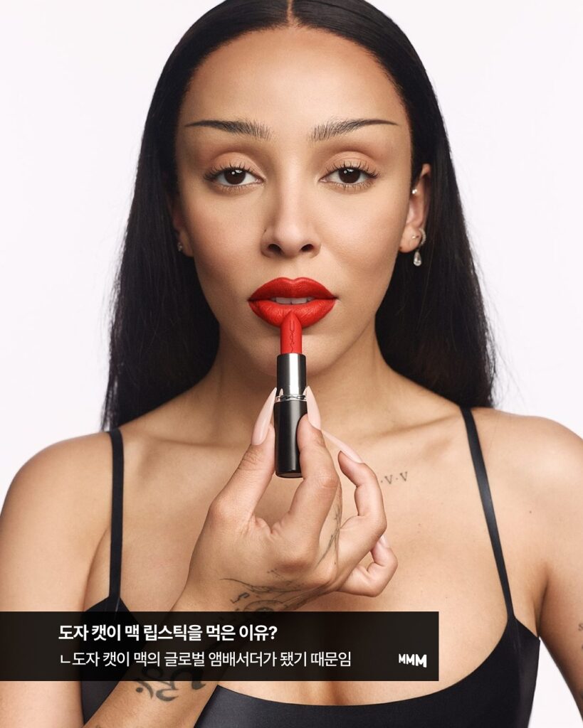 VMA 레드카펫에서 과감하게 립스틱을 먹는 듯한 퍼포먼스를 보여준 도자 캣(@dojacat). 사실 이 퍼포먼스는 그녀가 맥(@maccosmetics)의 글로벌 앰배서더로 발탁된 뒤 선보인 연출이었다고 하는데요. 무대 메이크업 또한 맥 제품으로 완성됐죠✨ 그리고 맥의 인스타그램에 올라온 도자 캣 립의 가격($926.25)을 보고 팬들은 9월 26일 새로운 앨범이 나올 것으로 추측하고 있죠. 오랫동안 ‘맥걸’이었다는 도자 캣과 맥의 만남, 앞으로 펼쳐질 시너지 너무 기대되지 않나요?👏🏻