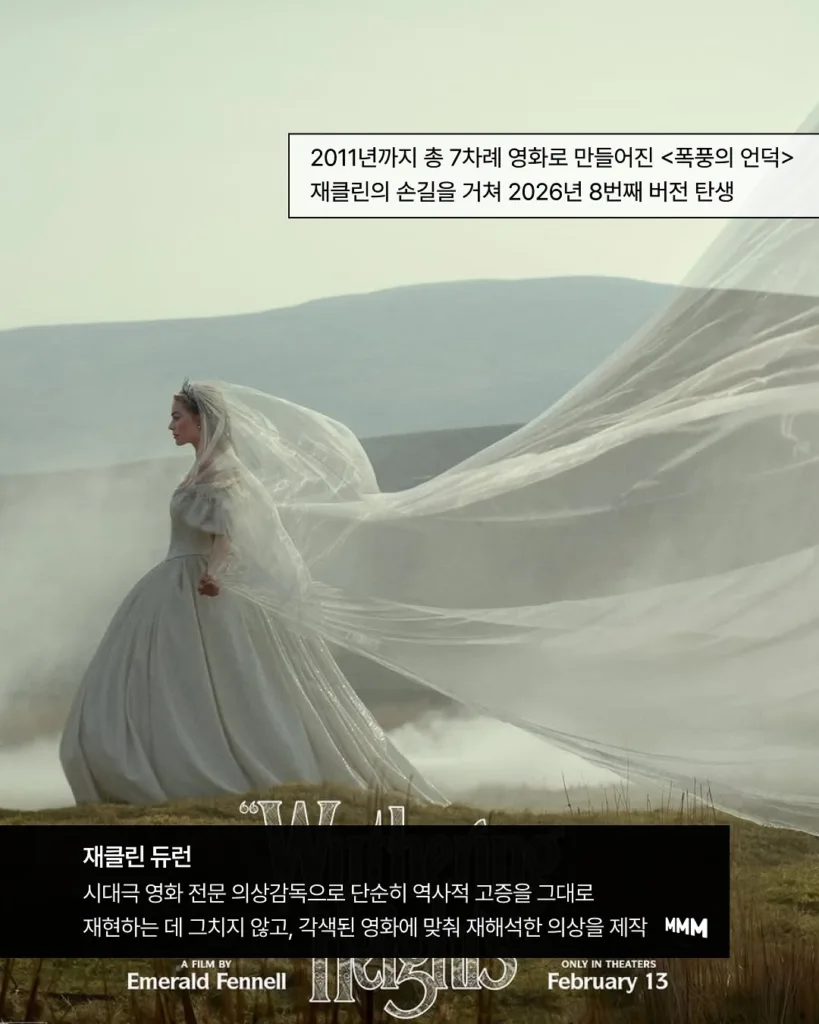 재클린 듀런은 원작의 의상을 단순히 재현하는 데 그치지 않고, 각색된 영화의 서사에 맞추어 새로운 관점에서 의상을 재해석합니다. 2026년 다시 탄생한 <폭풍의 언덕>은 과감하게 변화를 줘 로맨스를 더 강렬하게 표현하고 있습니다. 슬라이드를 넘겨 재클린의 손길이 닿은 영화 리스트를 확인해 보세요!