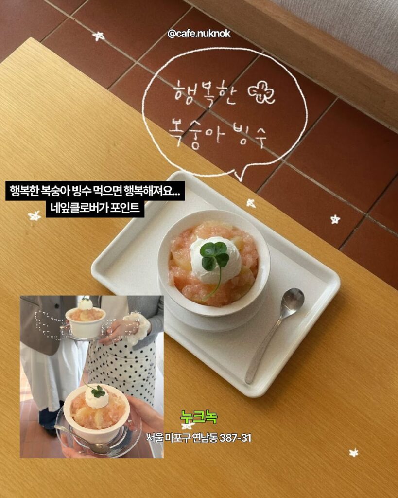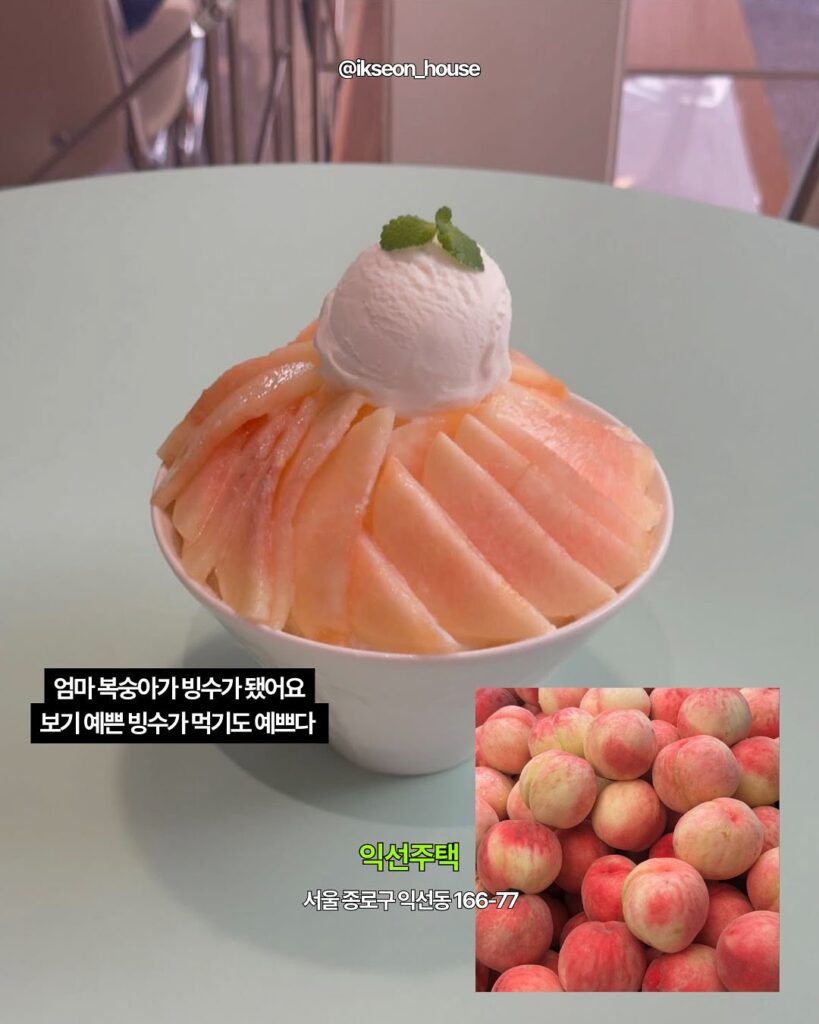 그중에서도 달달하고 과즙 가득한 복숭아 빙수는 여름이면 꼭 한 번은 먹어야 하는 ‘계절 음식’이 되었어요. 하얀 얼음이 보이지 않을 만큼 그 위를 잔뜩 덮은 복숭아 조각들과 부드러운 얼음, 복숭아 소스의 조합은 여름철 입맛을 돋우는 디저트로 제격이죠.