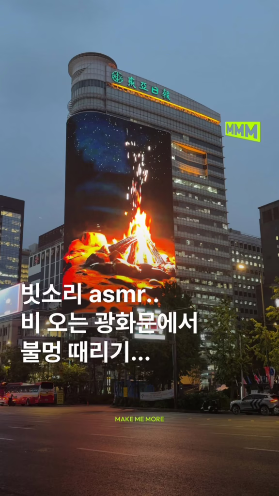 동아일보 건물의 룩스(LUUX) 전광판에 모닥불이 피워졌습니다. 빗소리와 함께 자연스러운 ASMR 분위기를 자아내는 그 현장을 mmm이 담아왔어요!