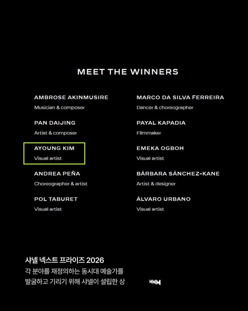 얼마 전 발표된 ‘샤넬 넥스트 프라이즈 2026’에 미디어 아티스트 김아영(@ayoung___kim)이 선정되었는데요, 해당 상은 샤넬(@chanelofficial)이 각 분야별 동시대 예술가를 발굴하고 기리기 위해 설립되었습니다. 사실 김아영은 이번 샤넬 넥스트 프라이즈 선정 외에도 화려한 수상 이력을 지닌 미디어 아티스트인데요. ‘2025년을 정의한 예술’, ‘2025 파워 100’ 77위에 오르는 등 전 세계가 김아영 작가를 주목하고 있습니다.