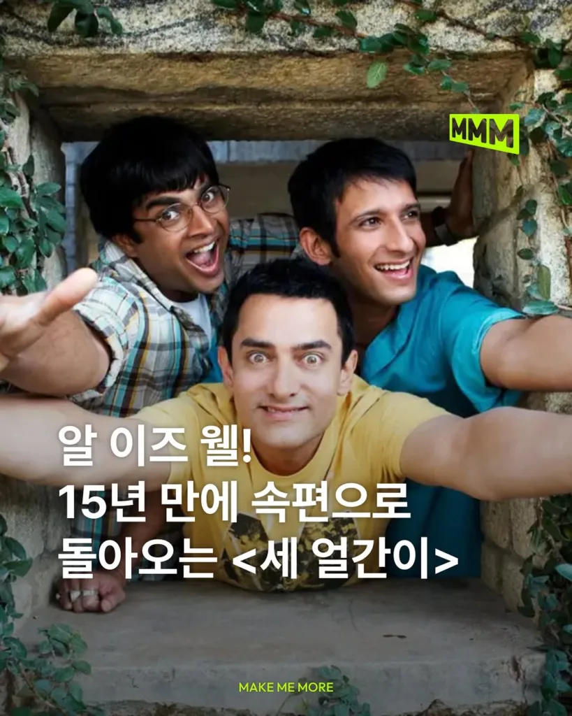 큰 사랑을 받았던 영화 ‘세 얼간이’가 속편으로 돌아옵니다 🙌🏻 현재 ‘네 얼간이(4 Idiolts)’리는 가제로 시나리오를 개발 중이라고 밝혔는데요. 무엇보다 반가운 소식은 원년 멤버인 아미르 칸, 샤르만 조시(@sharmanjoshi), R. 마다반(@actormaddy)이 15년 만에 뭉친다는 사실! 2009년에 개봉한 <세 얼간이>는 인도 영화 최초로 박스오피스에서 2억 루피(약 3,200억 원)를 돌파한 역사적인 작품인데요. 속편은 라지쿠마르 히라니 감독과 비두 비노드 초프라 감독의 연출로 제작될 예정이며, 배우 아미르 칸이 제작에 참여합니다. 현재 네 번째 얼간이를 신중히 물색 중이며, 내년 촬영에 돌입할 예정입니다.
