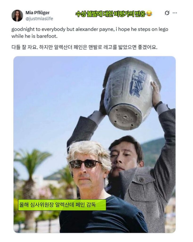 X상에서는 <어쩔수가없다>가 수상하지 못한 데 대한 비판이 이어지고 있으며, 일부는 영화 장면을 활용해 심사위원장 알렉산더 페인을 풍자하는 짤을 만들어 공유하고 있어요. 한편 <어쩔수가없다(@cjenmmovie)>는 오는 9월 24일 극장에서 개봉 예정입니다.🍿