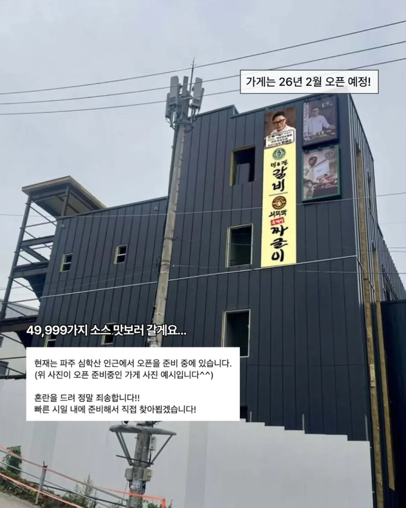 한편 그는 인스타그램을 통해 “현재 운영 중인 식당은 없으며, 백운호수 인근 한정식집과 국가공인 진갈비는 본인과 무관하다”라고 밝혔는데요. 이어 파주 심학산 인근에 내년(26년) 2월 오픈을 준비 중인 가게의 예시 사진을 공개했습니다! 사진 속 간판처럼 갈비와 흑돼지 짜글이, 파주 가면 맛볼 수 있는 걸까요 🫢 5만 가지 소스 맛보러 달려갑니다 🧑‍🍳