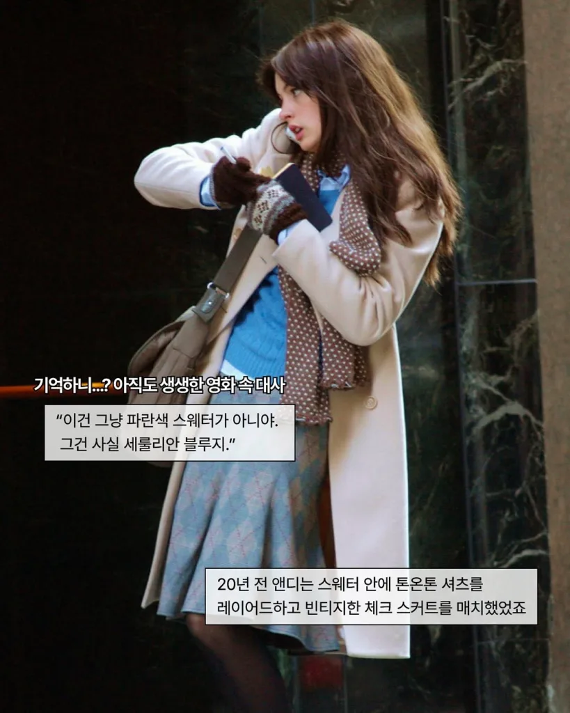 💬극중 패션 매거진 신입으로 입사한 앤디에게 미란다가 던진 말인데요. 하늘 아래 같은 컬러는 없다는 말의 시초가 되어 상징적 대사로 현재까지 회자되고 있죠.