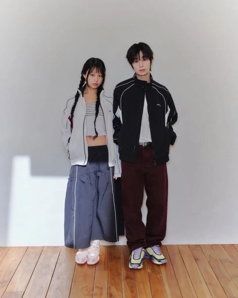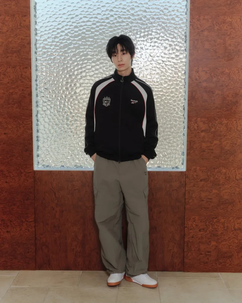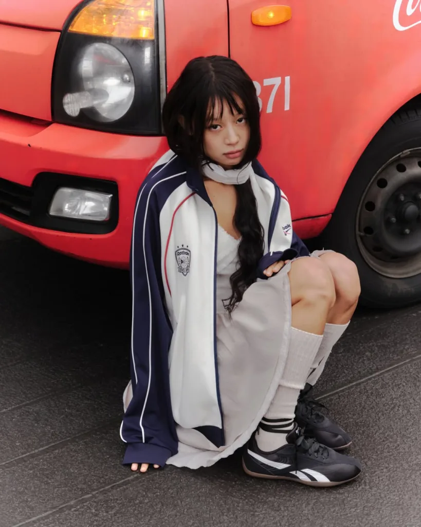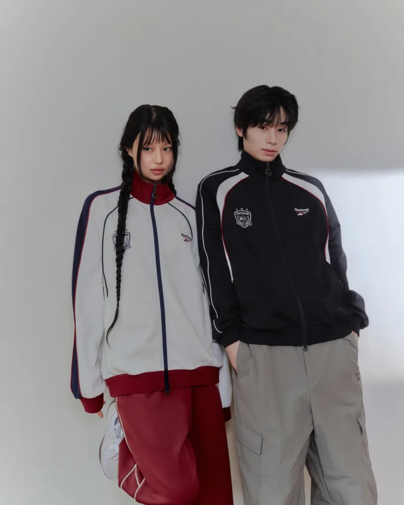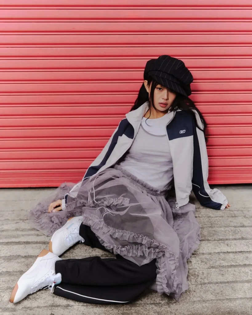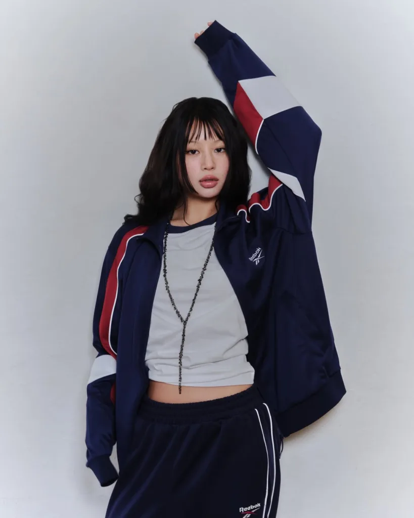 ‘Born Classic. Worn for Life’를 주제로 2000년대 리복 무드를 감각적이고 스포티하게 재해석한 에슬레저룩을 제안했는데요. 볼드한 타이핑과 자수 디테일을 더한 트랙 재킷에 편안하면서도 사랑스러운 무드의 스트링 스커트 조합과 크롭 기장