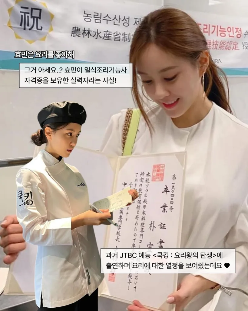 과거 요리 예능 프로그램 <쿡킹 : 요리왕의 탄생>을 통해 요리 실력을 선보였던 효민은 2018년 일식조리기능사 자격증도 딴 찐 실력자인데요. 더 놀라운 건 일식만 잘하는 게 아니라 한식부터 디저트까지 모두 섭렵했다는 사실!
