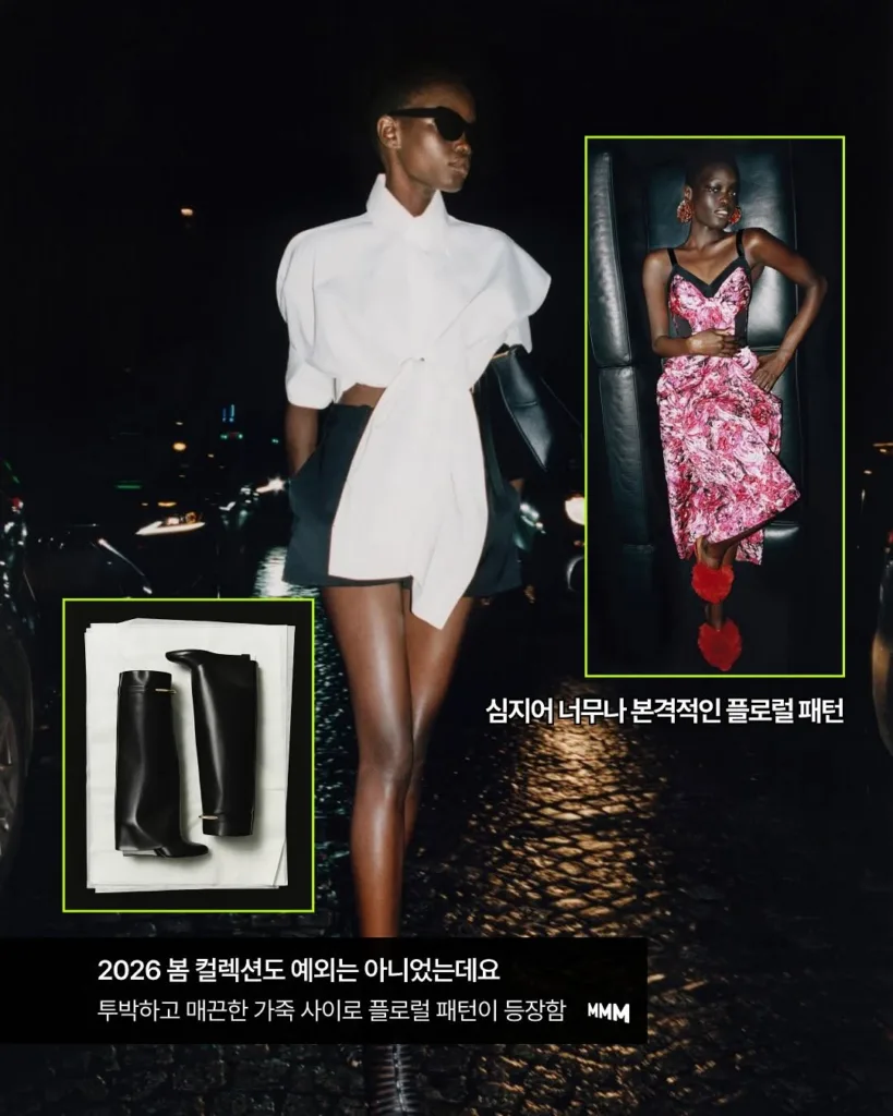 지방시는 원래 블랙과 화이트 계열의 컬러에 미니멀한 디자인으로 승부보기로 유명한데요. 최근 선보인 의상들에서는 유독 플라워 패턴과 장식이 자주 등장하고 있습니다. 2026년 트렌드로 빈티지 플라워 패턴이 언급이 된 만큼, 지방시도 이에 슬며시 탑승한 것 같은데요.