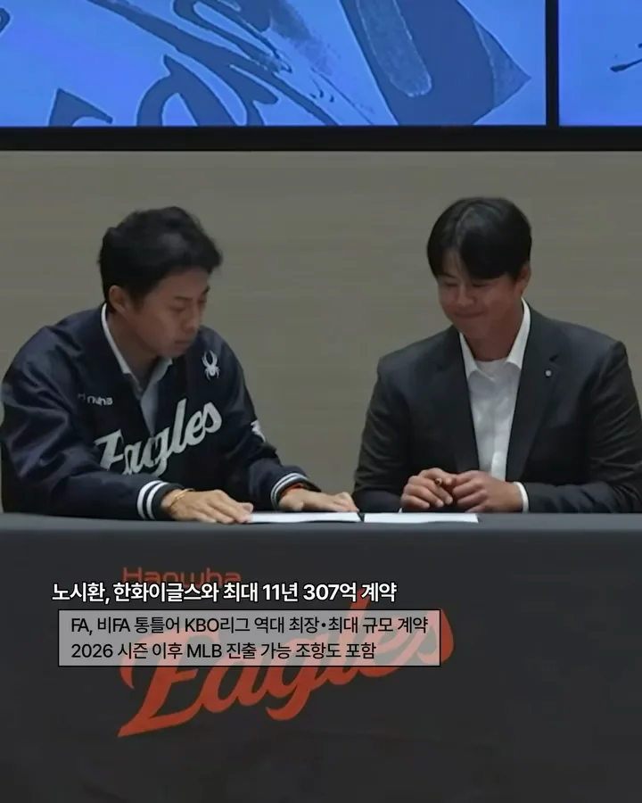 한화이글스 노시환(@hwanisi)선수가 오늘(23일) 한화이글스(@hanwhaeagles_soori)와 최대 11년 307억 계약을 발표했습니다. 비FA(자유계약선수) 다년계약을 맺어 ‘종신한화’를 선언했는데요, 계약 내용은 역대 최장•최대 계약으로 기록됐습니다. 노시환 선수는 2023시즌 31홈런 101타점으로 홈런과 타점 부문에서 1위, 2024시즌 24홈런, 2025시즌 32홈런을 기록하며 장타력을 뽐내는 거포형 타자임을 입증하고 있는데요, 한화이글스와의 다년계약으로 앞으로의 활약이 기대되고 있습니다👏🏻