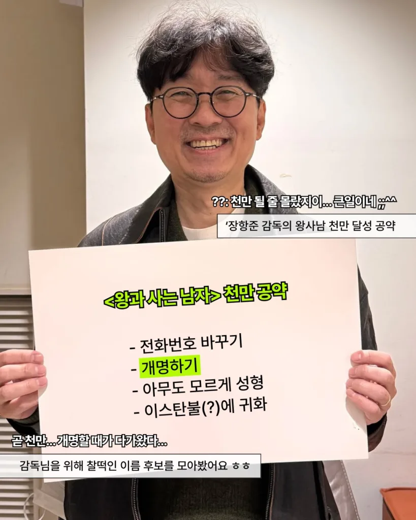 최근 SNS에서 장항준 감독의 <왕과 사는 남자> 천만 공약이 화제입니다. 지난 1월, 장항준 감독은 <배성재의 텐(@sbs_ten)>에 출연해 ”만약 천만이 된다면 전화번호 바꾸고, 개명하고, 성형할 겁니다. 그리고 이스탄불로 귀화할까도 생각 중이에요. 아무도 날 안 찾았으면 좋겠다“며 농담처럼 공약을 내걸었는데요. 최근 <왕과 사는 남자>가 900만을 돌파하며 해당 공약이 재조명되었습니다. 이에 네티즌들을 장항준 감독의 새 이름을 지어주기 시작했고, 장경거망동부터 장사남까지 다양한 이름이 탄생했습니다.