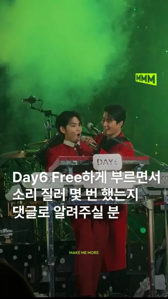 데이식스(@day6kilogram)가 ‘Free하게’를 부르다 “소리 질러” 몇 번 했는지 아시나요..? 에디터는 소리를 너무 많이 질러서 이 곡 후에 목이 쉬었답니다👋🏻 아시는 분은 댓글로 남겨주세요!