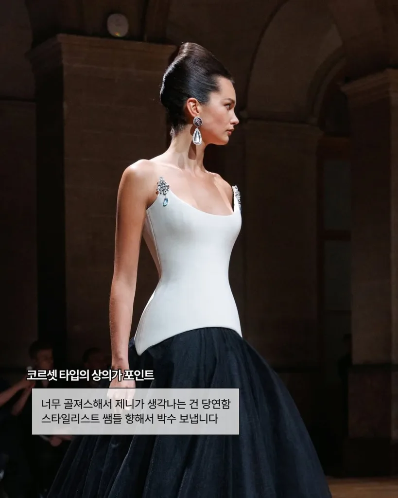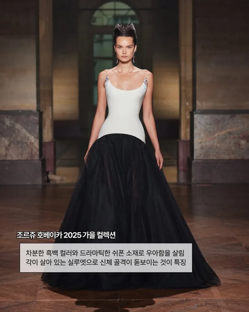 해당 드레스는 브랜드 조르쥬 호베이카(@georgeshobeika)의 2025 가을 컬렉션으로, 브랜드 설립 30주년을 기념한 꾸뛰르 의상인데요. 차분한 컬러감과 각이 살아 있는 실루엣이 전체 무드를 결정하는 만큼 제니와 찰떡일 수밖에 없죠.